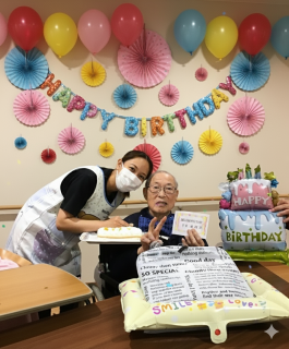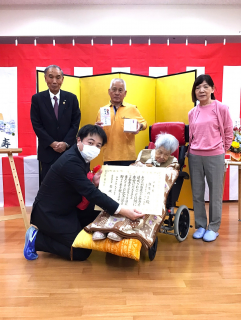 10月16日に、小坂泰久酒々井町長にご来所いただき、百寿を迎えられたご入居者様に、表彰状と記念品の授与を賜りました。 目指せ(^▽^)/世界最高齢! |