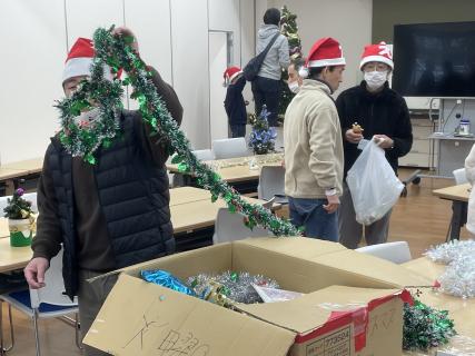 飾り付け中からサンタ帽と音楽で気分もあげつつ会場作りをがんばるぞー!